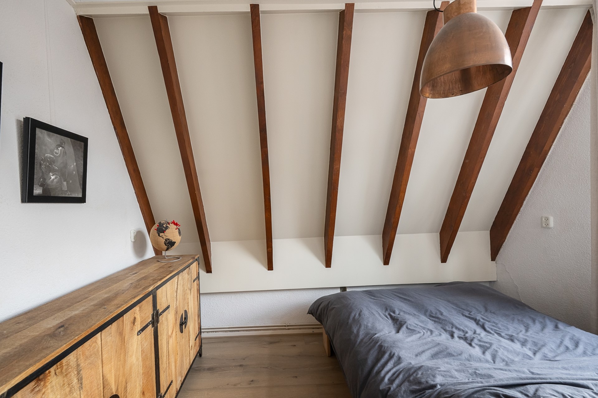 De slaapkamer is gelegen aan de achterzijde en heeft voldoende plek voor een tweepersoonsbed. De lichte vloer loopt naadloos door, wat zorgt voor een ruimtelijk effect.