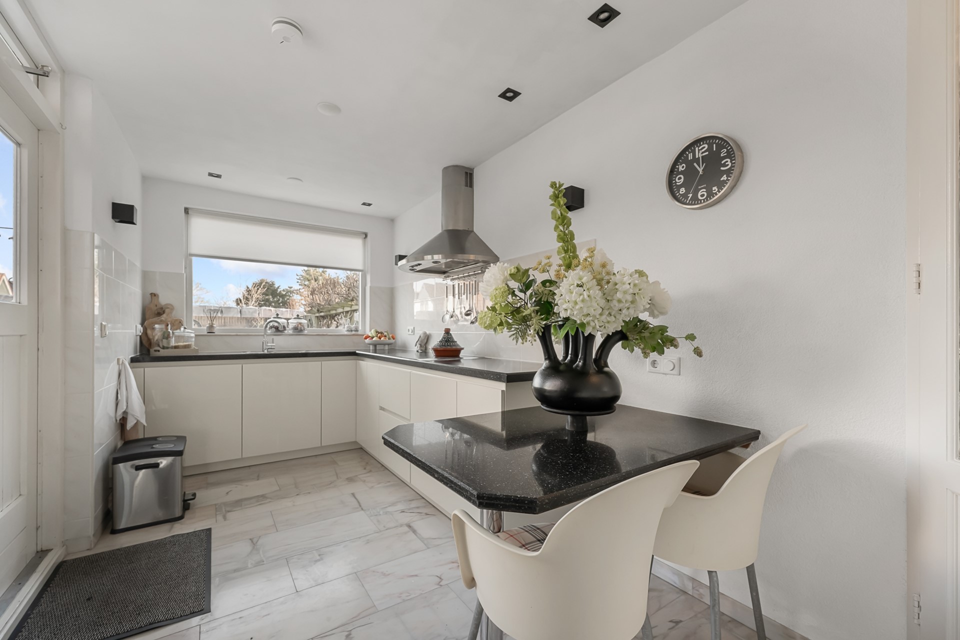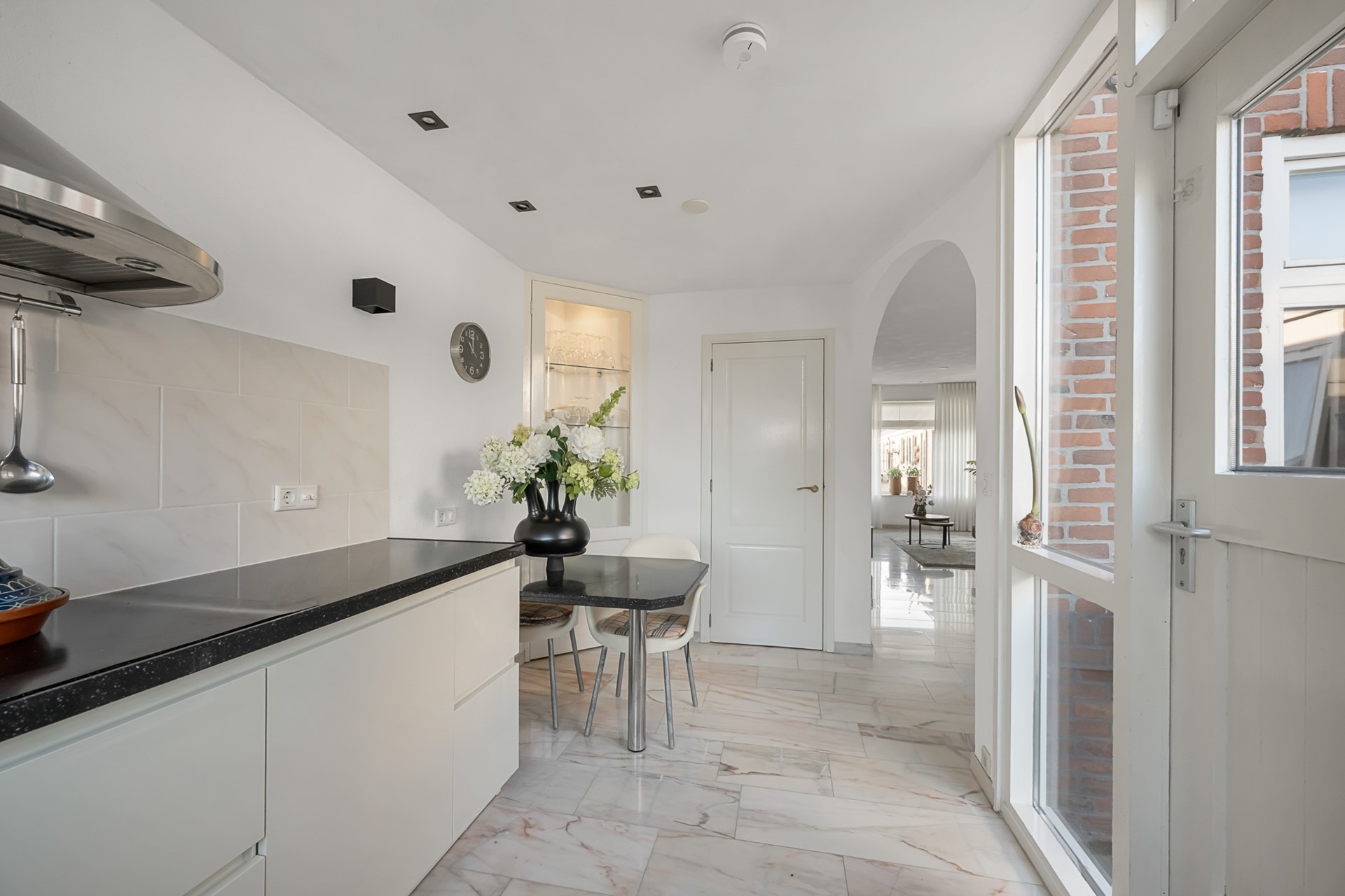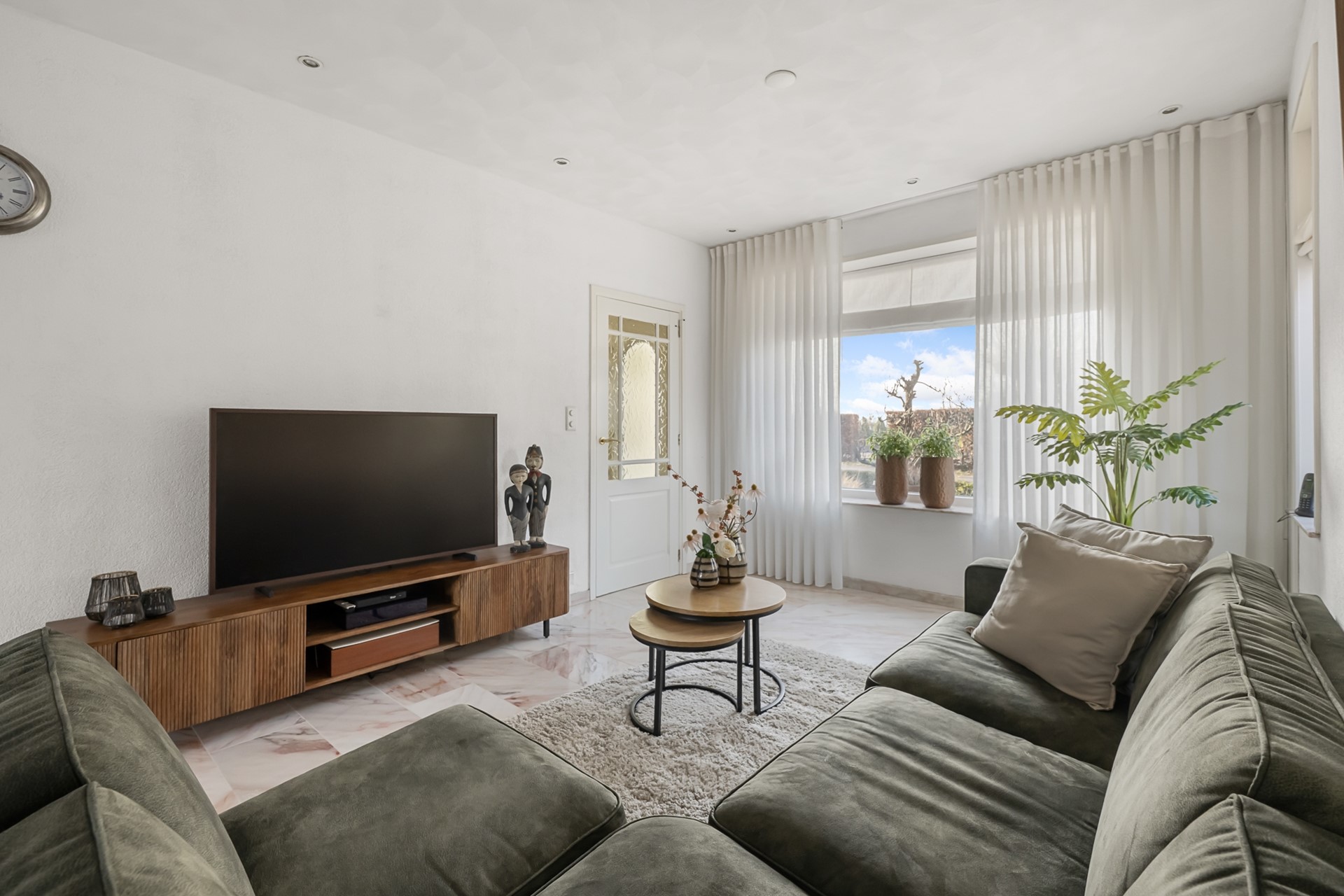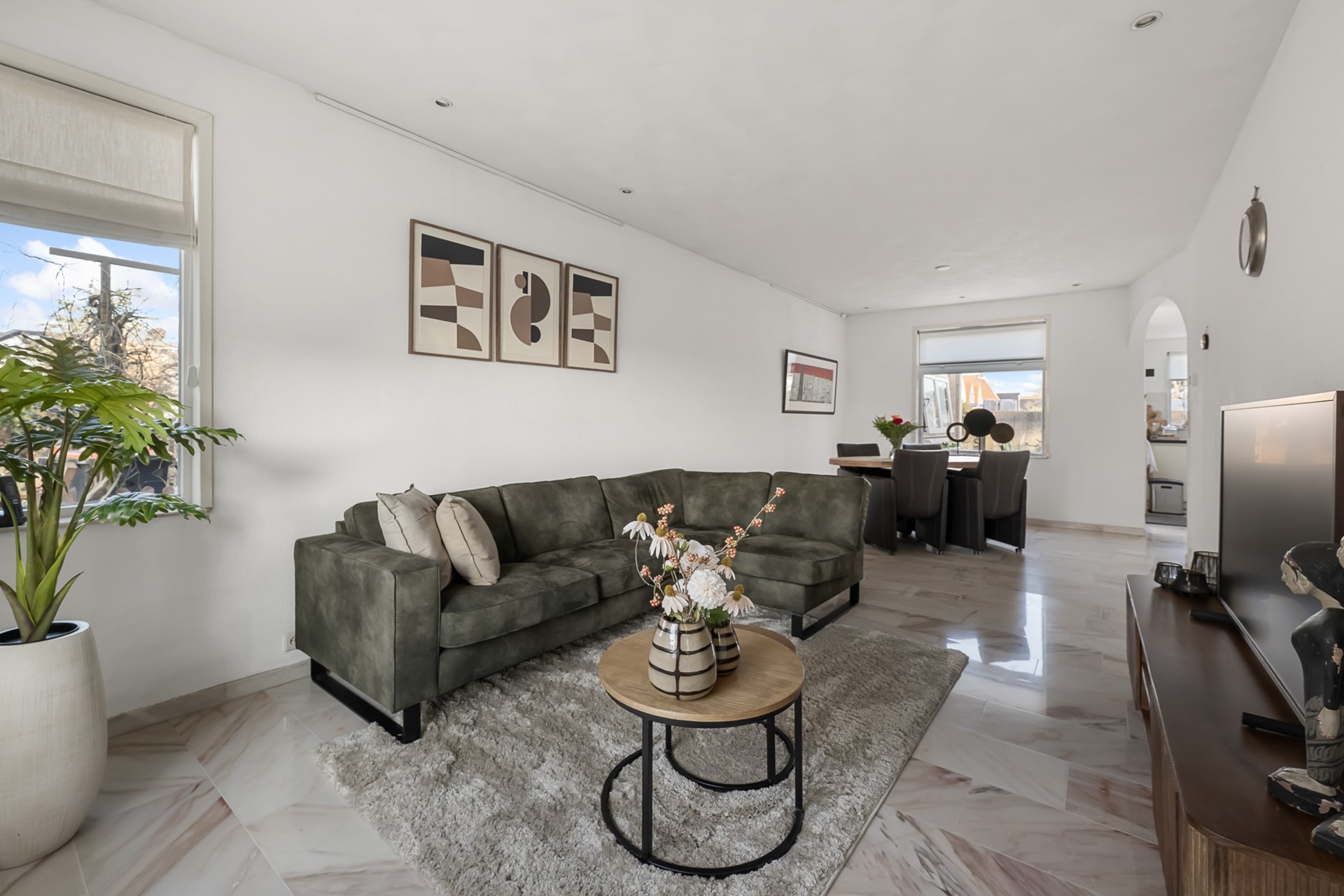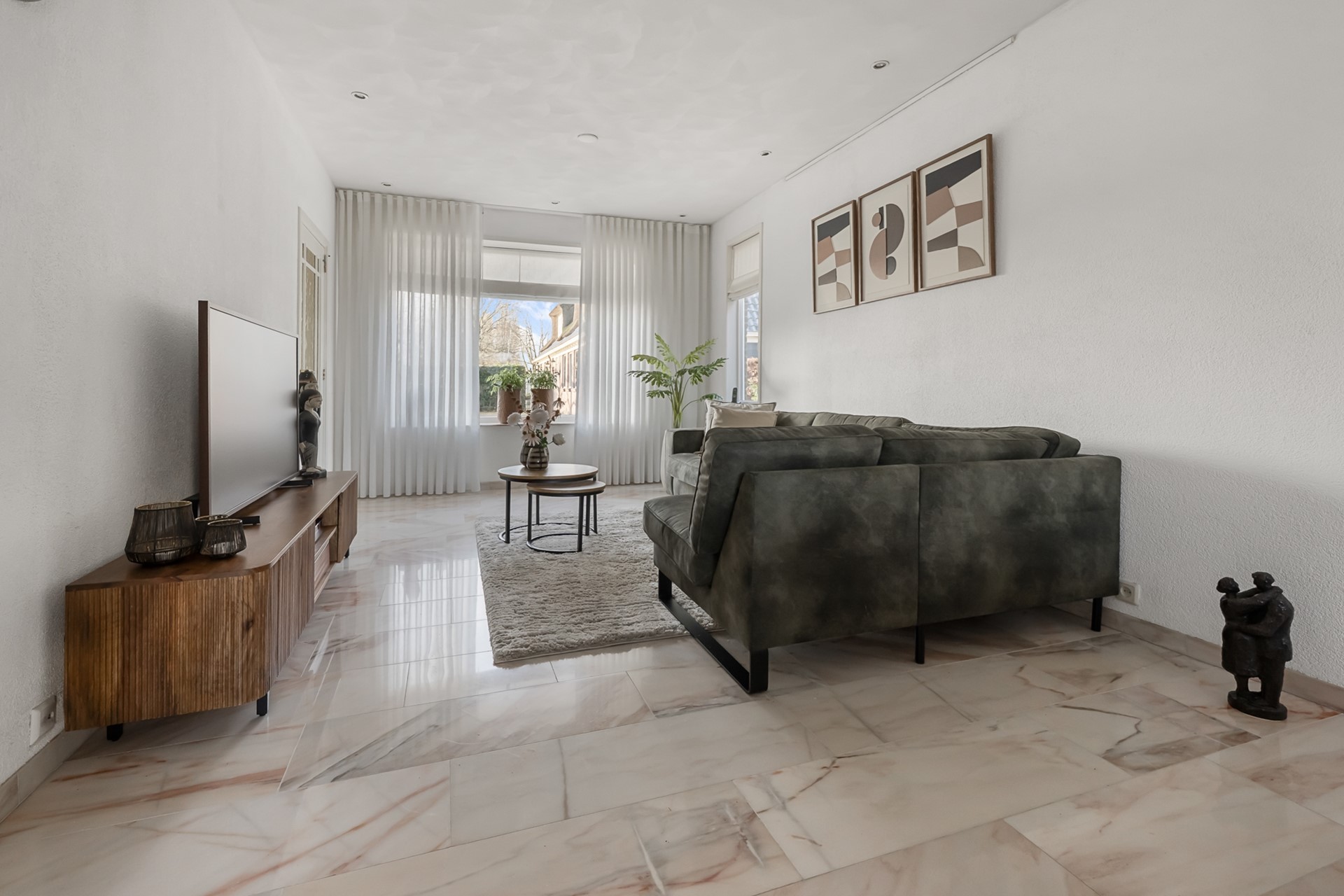 De woonkamer is een fijne, lichte leefruimte met een prettige hoeveelheid daglicht. De ruimte is strak afgewerkt en voorzien van een marmeren vloer met vloerverwarming, netjes gestuukte wanden en moderne inbouwspots. Dit zorgt niet alleen voor een luxe uitstraling, maar ook voor extra comfort en een aangenaam binnenklimaat.