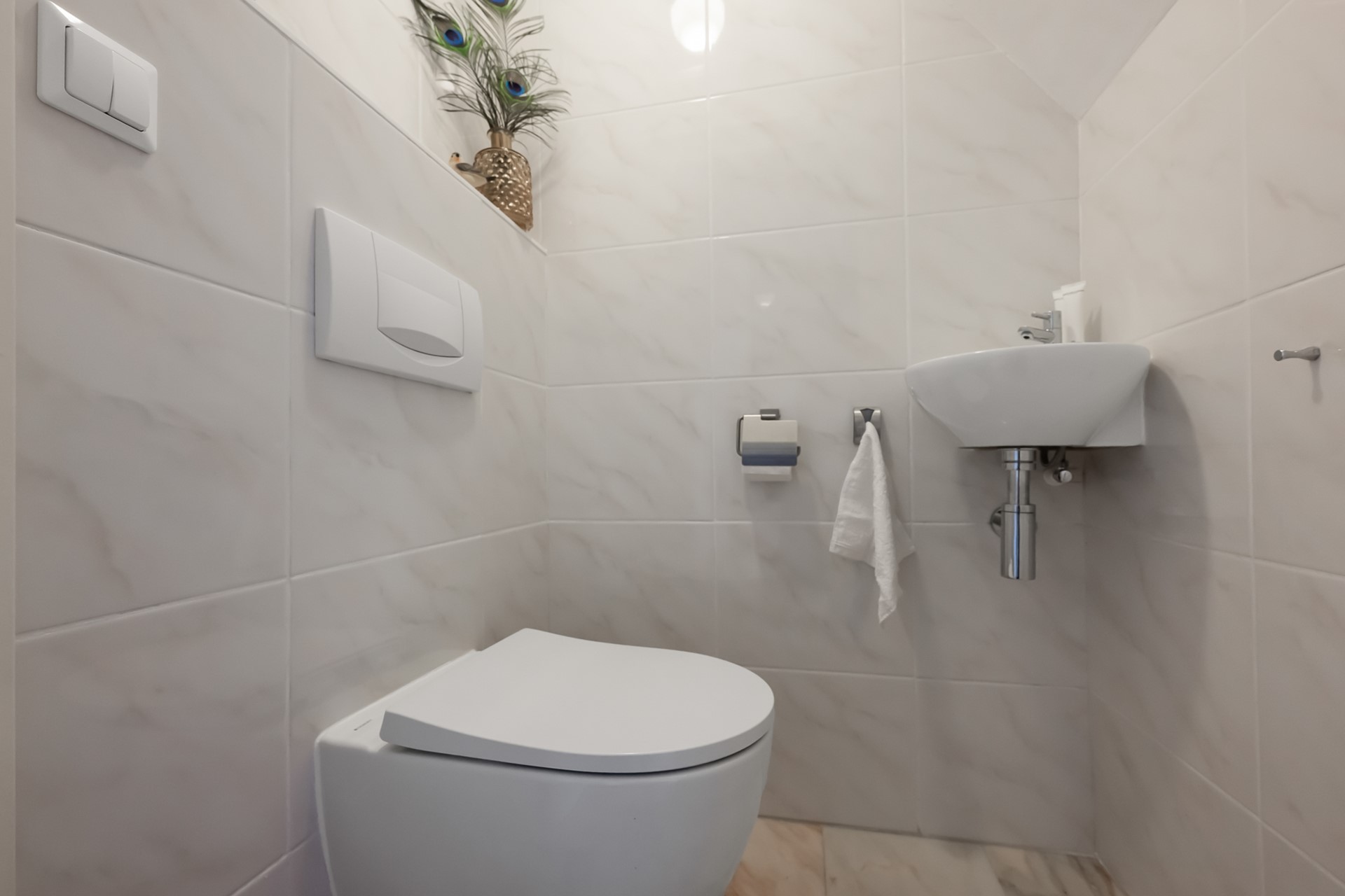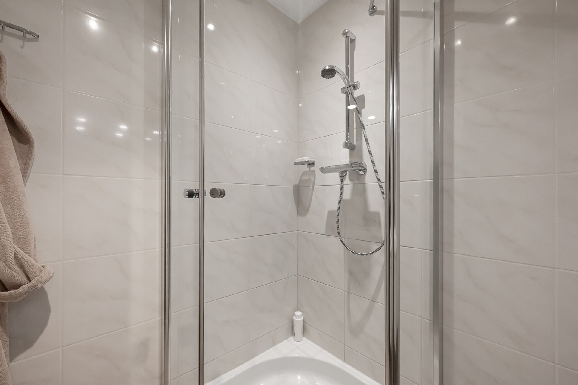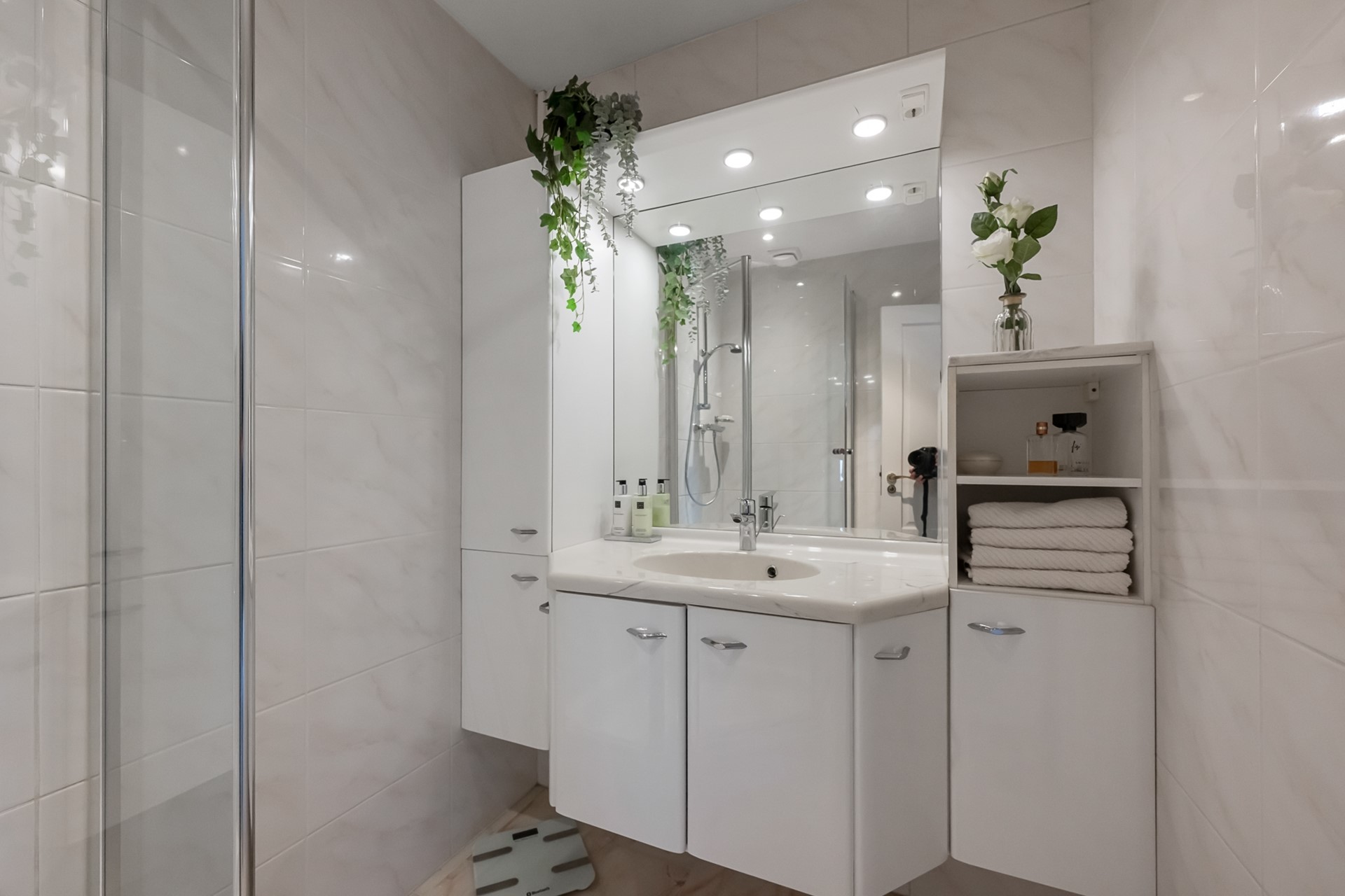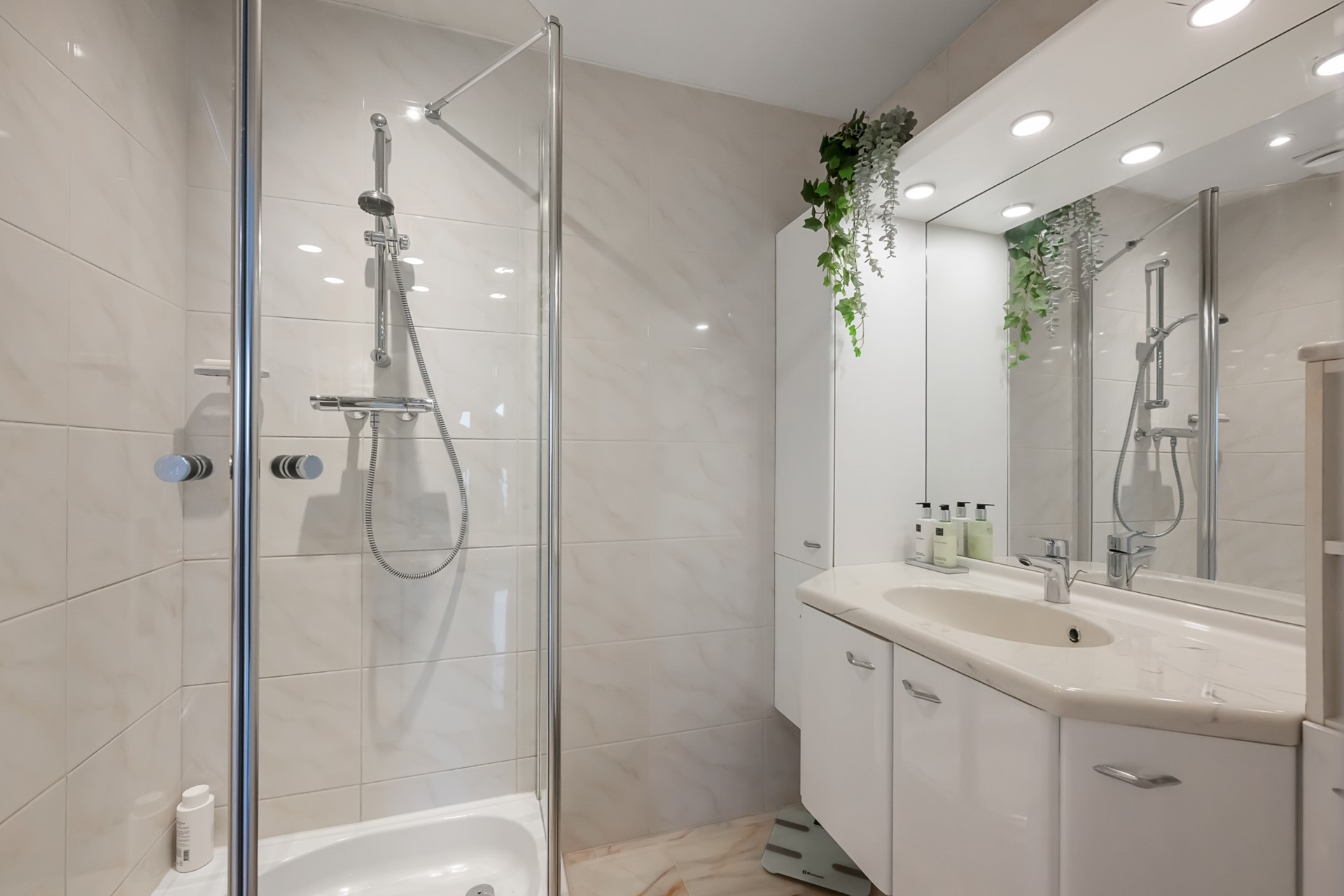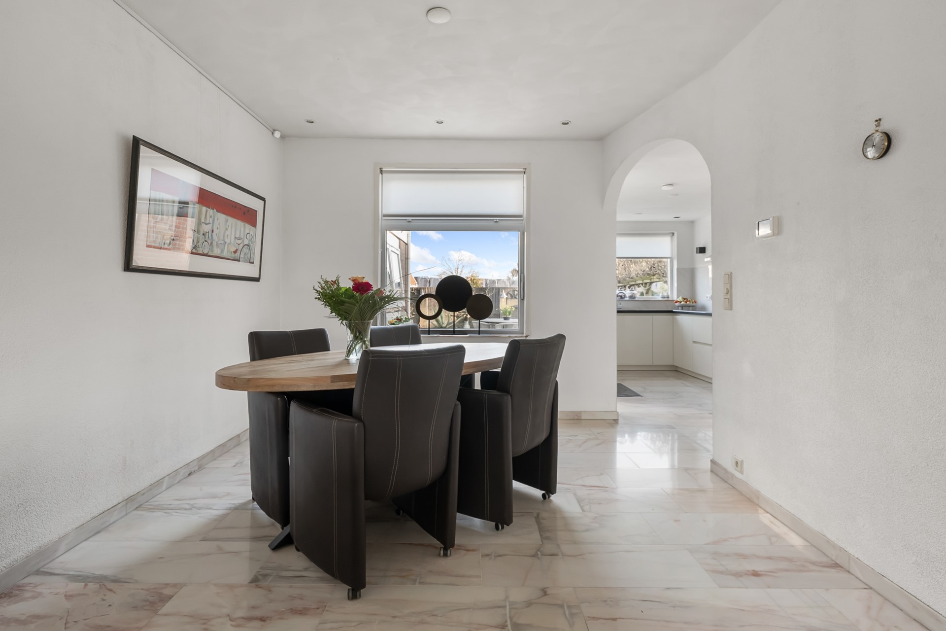 De woonkamer is een fijne, lichte leefruimte met een prettige hoeveelheid daglicht. De ruimte is strak afgewerkt en voorzien van een marmeren vloer met vloerverwarming, netjes gestuukte wanden en moderne inbouwspots. Dit zorgt niet alleen voor een luxe uitstraling, maar ook voor extra comfort en een aangenaam binnenklimaat.