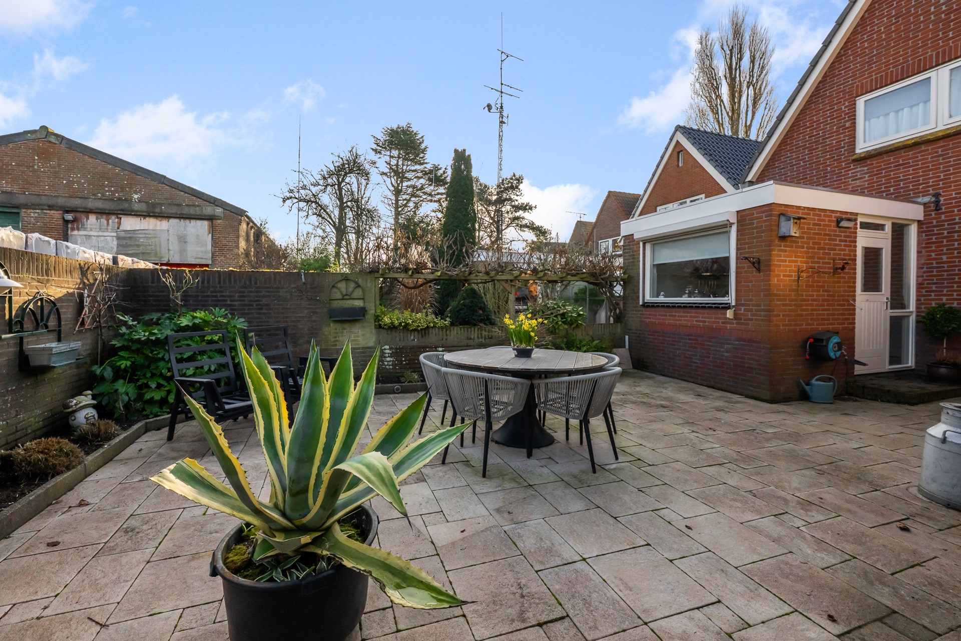 De achtertuin is grotendeels bestraat en gelegen op het oosten, waardoor je hier heerlijk van de ochtend- en middagzon kunt genieten. In de tuin staat een praktische schuur/berging, bereikbaar via zowel de achtertuin als de voortuin, ideaal om je fiets eenvoudig te stallen of extra spullen op te bergen.
