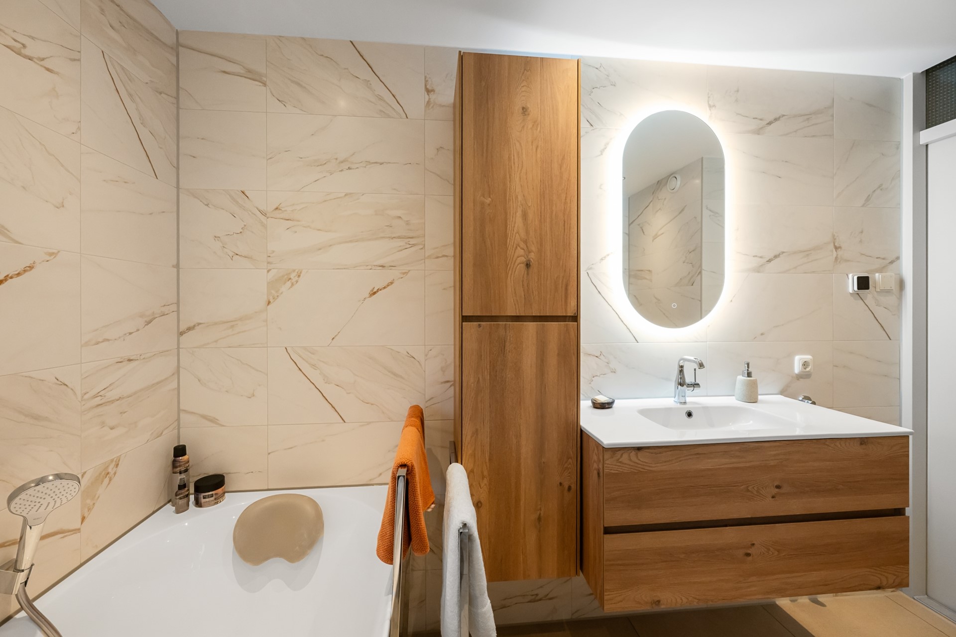 De badkamer uit 2023 is modern en luxe afgewerkt, met oog voor comfort en stijl. De badkamer beschikt over een ligbad, een aparte douche, een toilet, een modern wastafelmeubel en vloerverwarming, waardoor het altijd aangenaam warm is, zelfs op koude dagen.